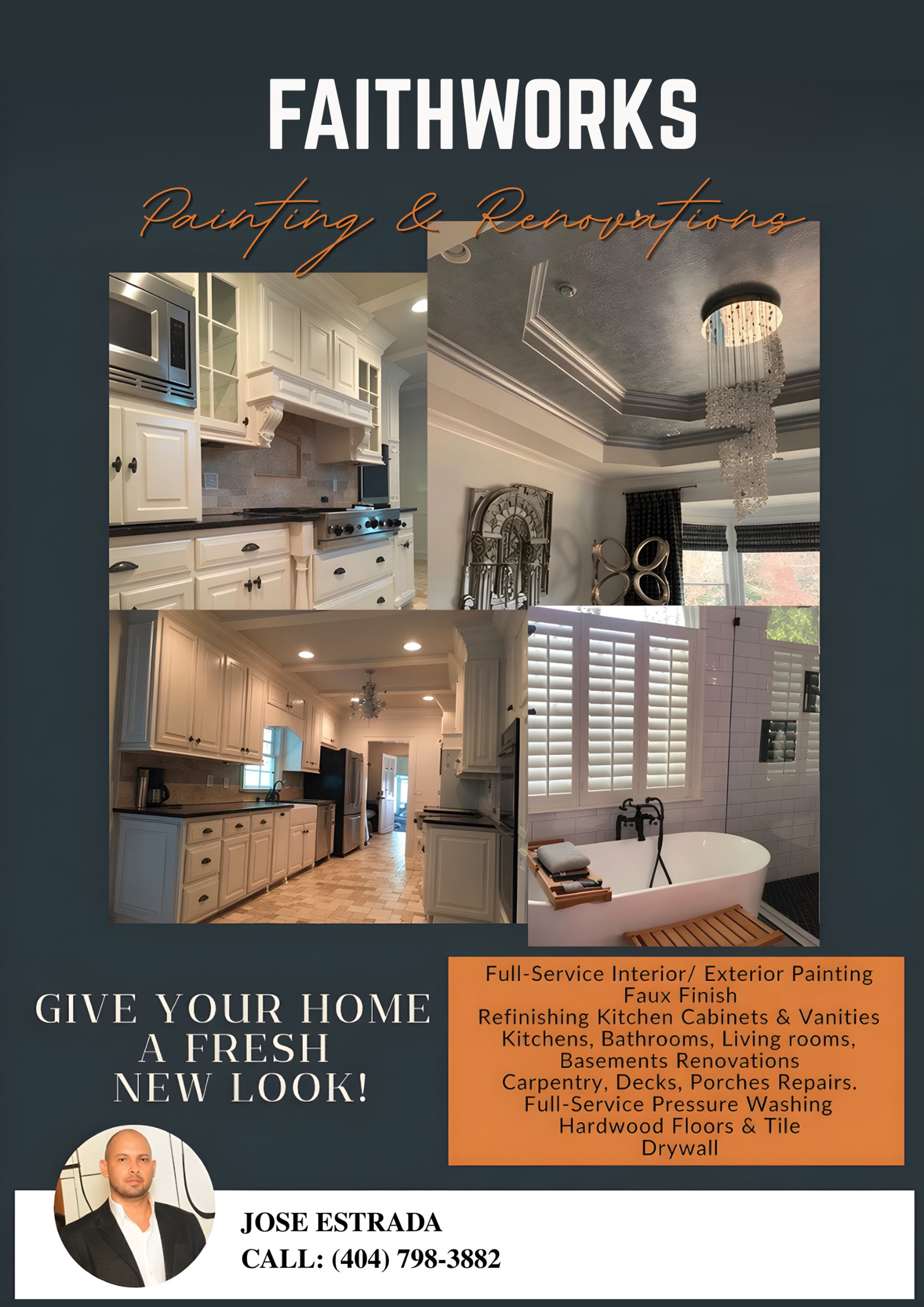 Welcome to FaithWorks Painting & Renovations—your trusted partner in transforming homes. With 25 years of experience in all types of painting and renovations, we bring a legacy of quality to every project. We specialize in interior and exterior residential painting, full home renovations—from bathrooms to kitchens—and expert flooring installation, including tile and hardwood. At FaithWorks, every project is guided by faith, ensuring care, integrity, and craftsmanship in all we do.